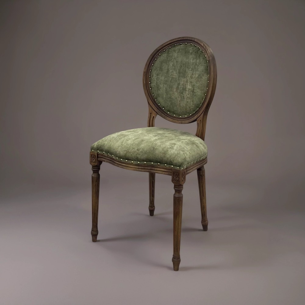Особенность стула Эдем заключается в его уникальной конструкции — изящная круглая спинка в форме медальона создаёт ощущение легкости и воздушности. Этот эффект усиливают декоративные гвоздики, стилизованные под старину, которые украшают спинку, придавая ей винтажный характер. Стул не имеет подлокотников, что позволяет ему органично вписаться даже в небольшие помещения, не загромождая пространство.