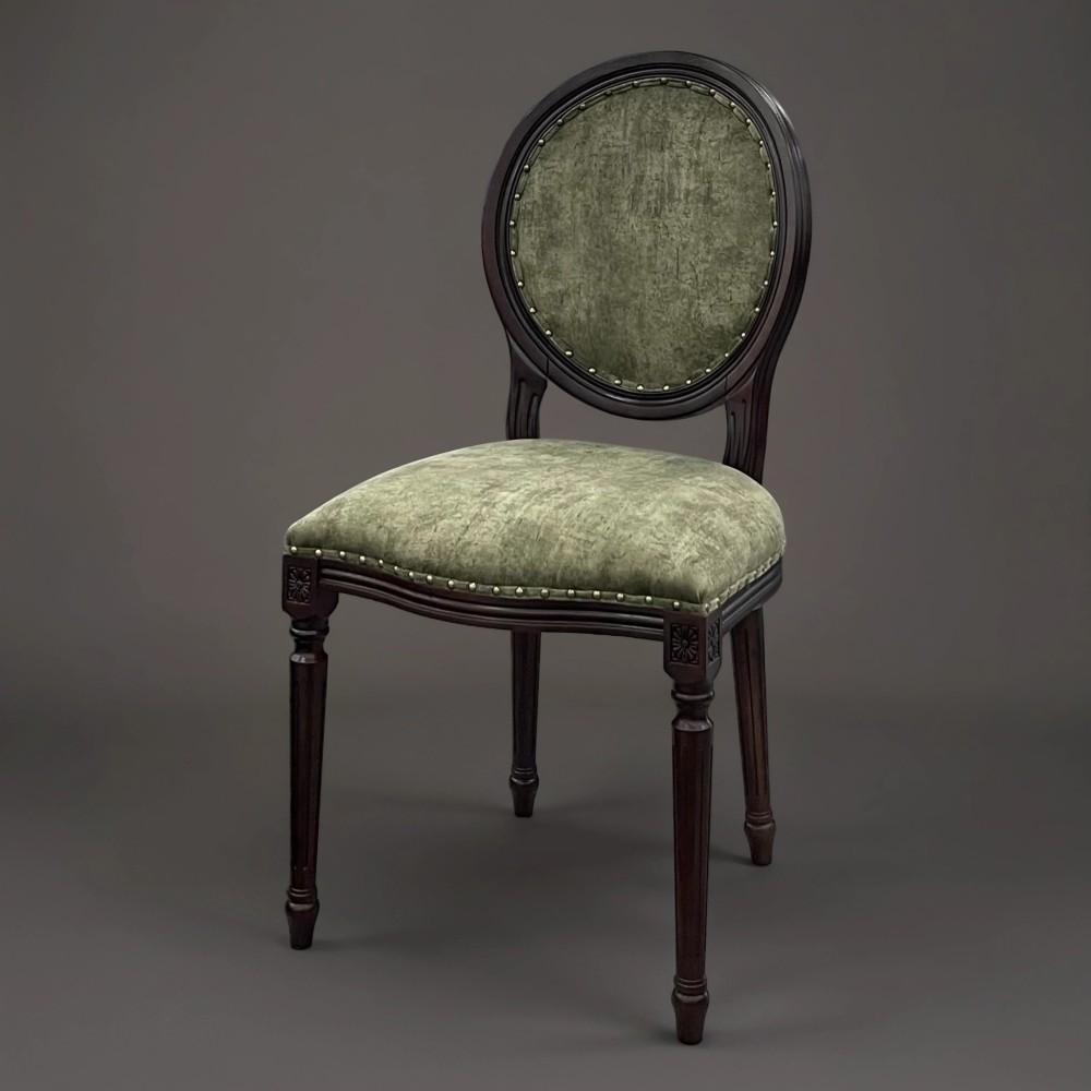 Особого внимания заслуживает спинка стула, оформленная декоративным молдингом и украшенная бронзовыми гвоздиками. Эти элементы добавляют изделию благородства и подчеркивают его уникальный дизайн. Окантовка круглой спинки и сиденья выполнена с особым вниманием к деталям, создавая завершенный и гармоничный облик.