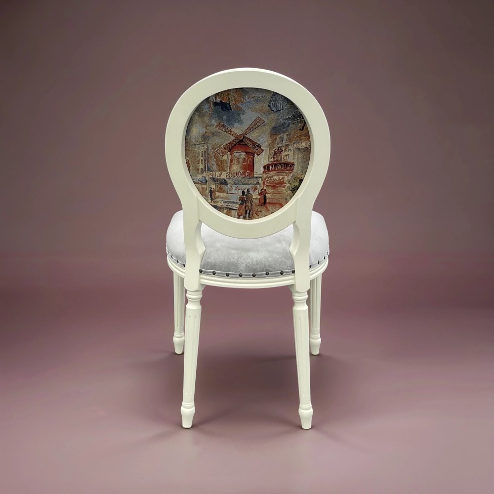 Основное внимание в дизайне уделено спинке, которая выполнена в форме круга и обита качественным гобеленом с уникальным узором, напоминающим атмосферу французской столицы. Гобеленовая обивка придаёт изделию изысканный и утонченный вид, помогая создать уютную обстановку в любом помещении.
