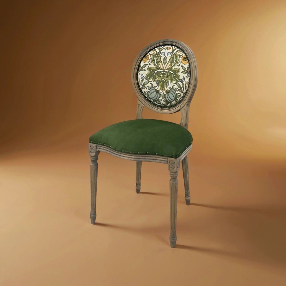 Особенность стула Эдем заключается в его уникальной конструкции — изящная круглая спинка в форме медальона создаёт ощущение легкости и воздушности. Этот эффект усиливают декоративные гвоздики, стилизованные под старину, которые украшают спинку, придавая ей винтажный характер. Стул не имеет подлокотников, что позволяет ему органично вписаться даже в небольшие помещения, не загромождая пространство.