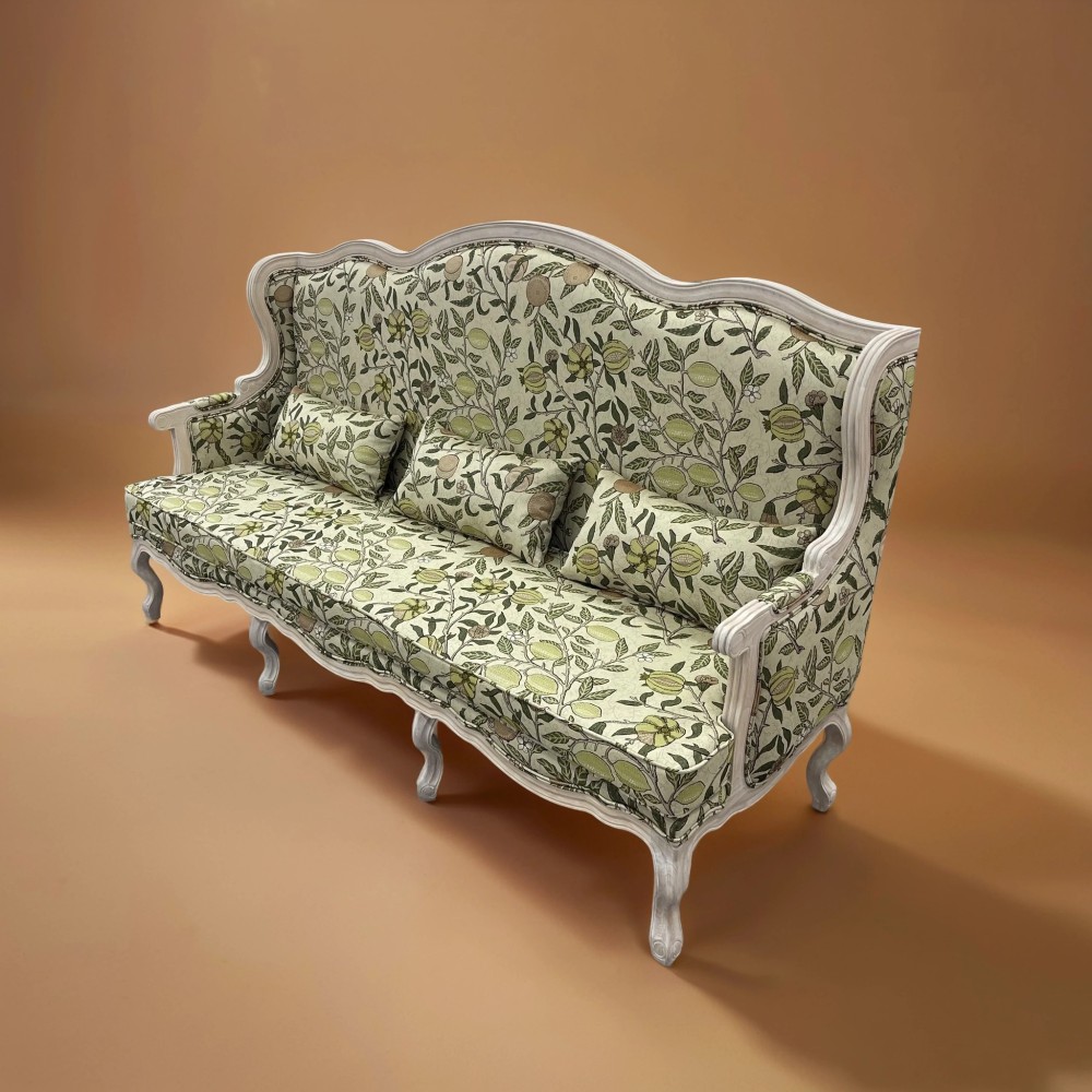 Конструкция из массива бука обеспечивает прочность и долговечность, гарантируя долгие годы эксплуатации без потери первозданного вида. Натуральная обивка из гобелена с узором, вдохновленным работами Уильяма Морриса, добавляет особое очарование этому предмету мебели. Пастельные оттенки патисонов создают спокойную и гармоничную атмосферу, в которую легко влюбиться.