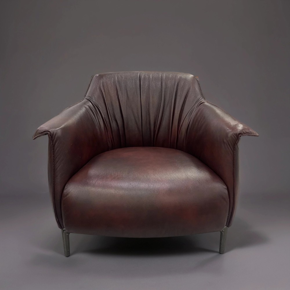 Спинка кресла выполнена в плавных, мягких линиях, которые обволакивают и поддерживают тело, обеспечивая максимальное удовольствие от отдыха. Эффектный защип придает ей выразительность и завершает образ изделия, превращая кресло в стильный акцент вашей гостиной или кабинета.