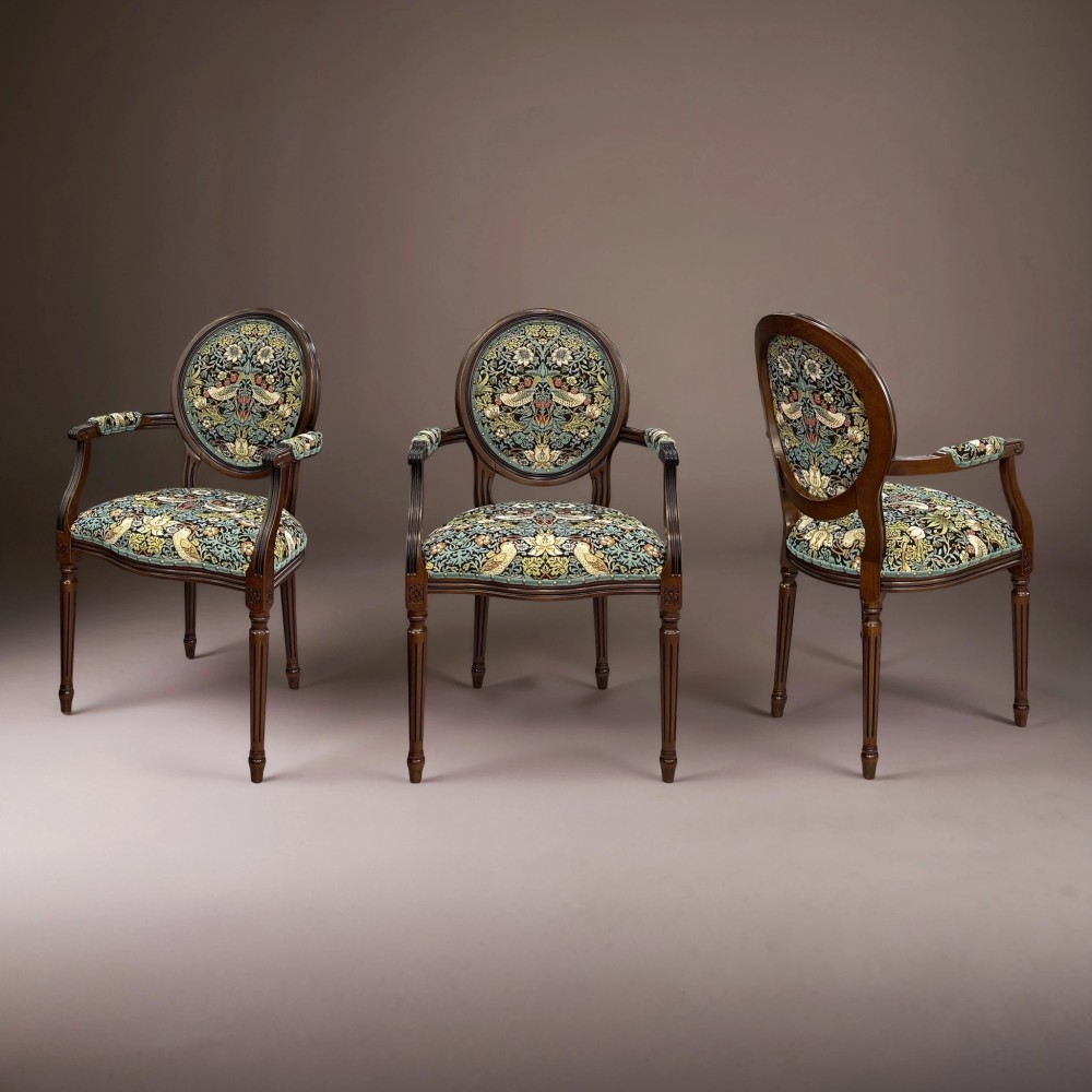 Спинка кресла имеет круглую форму и выполнена в виде медальона, что придает изделию особый шарм и утонченность. Она полностью обтянута гобеленом, вдохновленным работами Уильяма Морриса, известного своими художественными композициями. Ткань украшена рисунком Земляничный вор, что добавляет креслу историческую глубину и культурное значение.