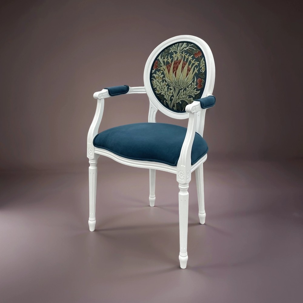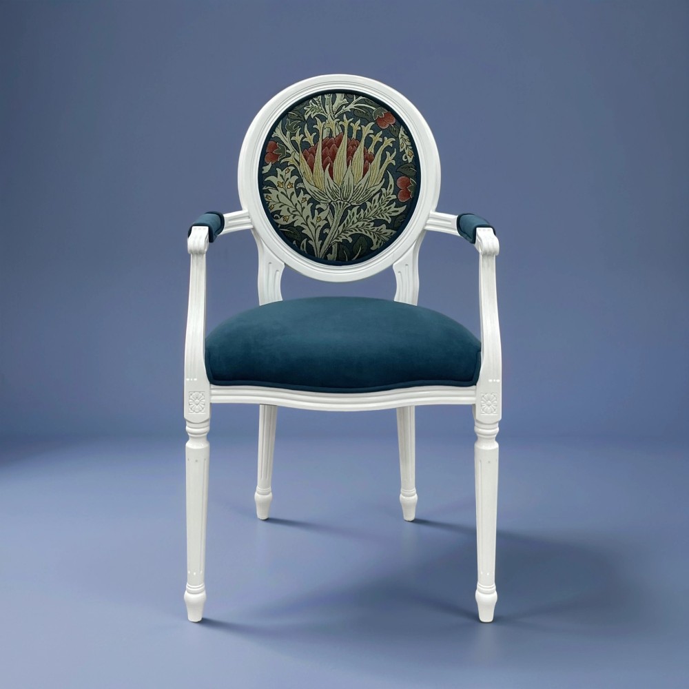 Одним из главных достоинств модели является ее гобеленовая спинка, вдохновленная работами знаменитого дизайнера Уильяма Морриса. Этот художественный элемент придает изделию особый шарм и изысканность. Узоры, выполненные с любовью к деталям, создают атмосферу утонченности и гармонии, привнося в ваш дом дух английской классики.